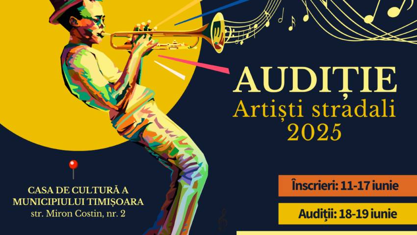 Casa de Cultură a Municipiului Timișoara organizează, în perioada 18-19 iunie 2025, audițiile pentru autorizarea artiștilor stradali. Cei interesați se pot înscrie până pe 17 iunie, trimițând formularul completat la adresa de e-mail office@ccmt.ro sau direct la sediul instituției, între orele 9:00-14:00. conform: https://www.radiotimisoara.ro/