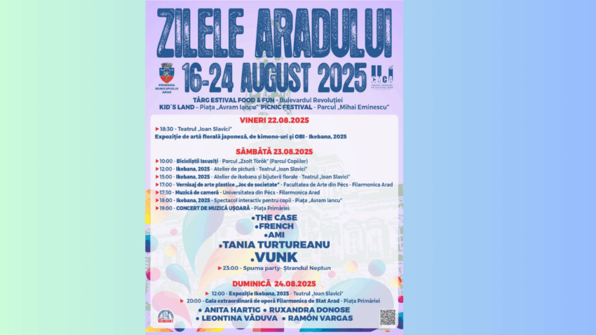 Organizatorii promit un spectacol cu sunet și lumini de excepție, menit să aducă împreună comunitatea în cadrul uneia dintre cele mai așteptate seri ale Zilelor Aradului.