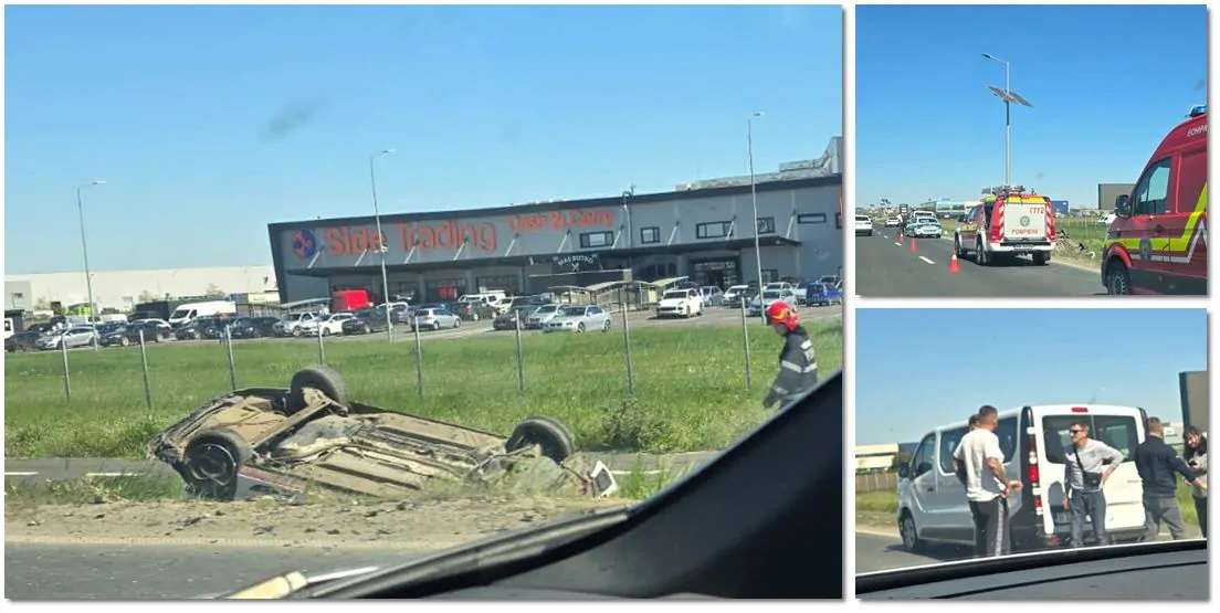 În urma impactului, mașina lovită a părăsit partea carosabilă și s-a răsturnat cu roțile în sus.