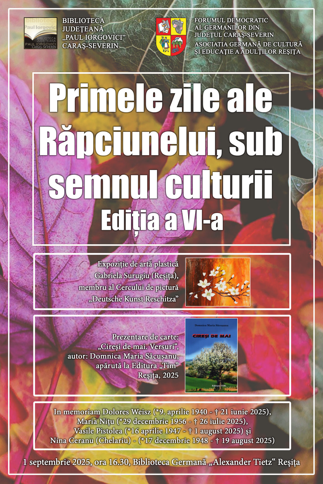 Biblioteca Județeană „Paul Iorgovici” Caraș-Severin, în parteneriat cu Forumul Democratic al Germanilor din județ și Asociația Germană de Cultură și Educație a Adulților Reșița, organizează luni, 1 septembrie 2025, de la ora 16:30, la Biblioteca Germană „Alexander Tietz”, ediția a VI-a a evenimentului cultural „Primele zile ale Răpciunelui, sub semnul culturii”, conform: https://www.radioresita.ro/