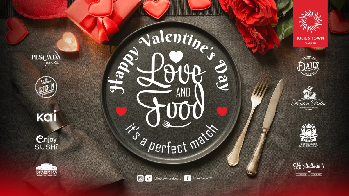 Și cum ,,Love and Food – It’s a perfect match!”, restaurantele din Iulius Town, cum sunt Czech In Iulius Town by Staropramen sau Pescada Porto, oferă meniuri speciale cu ocazia celei mai așteptate sărbători a dragostei, dar și o atmosferă care îmbină designul elegant al locației cu muzica live. Și la Daily Timișoara, at Fabrika, Enjoy Sushi, Kai, C House Milano, Fenice Palas Timișoara sau La Trattoria Bistro&Lounge poți petrece seri minunate, pentru că răsfățul culinar va îmbrăca cele mai inedite forme.
