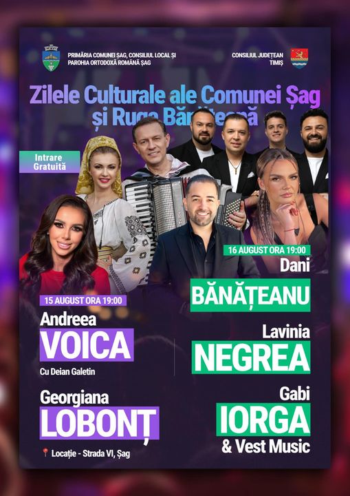 Primăria și Consiliul Local ale Comunei Șag, alături de Parohia Ortodoxă Română Șag, anunță cu entuziasm organizarea Zilelor Culturale ale Comunei Șag și a Rugii Bănățene în datele de 15 și 16 august, conform: https://debanat.ro/