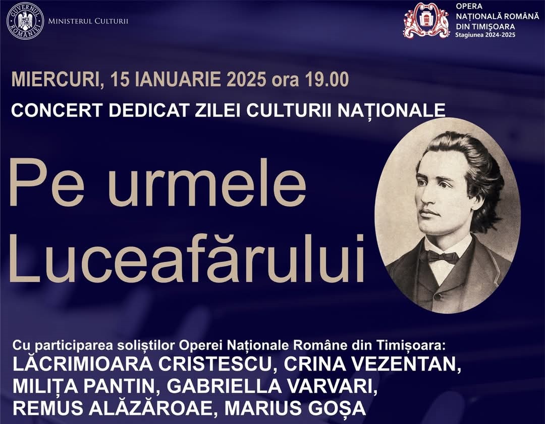 Opera Națională Română din Timișoara marchează Ziua Culturii Naționale, pe 15 ianuarie, cu evenimentul special „Pe urmele Luceafărului”, dedicat operei lui Mihai Eminescu și promovării valorilor culturale românești. Programul începe la ora 19:00, iar accesul este gratuit, pe bază de bilete disponibile la agenția Operei, conform: https://www.ziuadevest.ro
